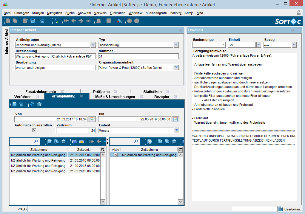 Hierzu zählt die Wartung von Anlagen, Messgeräten, und lüftungstechnischer Einrichtungen ebenso wie die regelmäßige Reinigung von beispielsweise Absaugkanälen und Absaugschlitzen. Verfügt eine ERP-Lösung über ein Wartungs- oder Instandhaltungsmodul, können diese Aufträge direkt im System geplant, ausgelöst und dokumentiert werden.